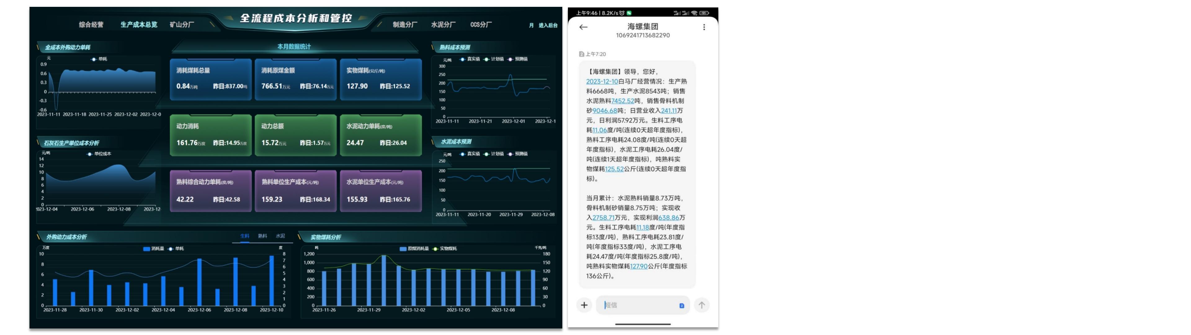 通过梳理企业生产、销售、管理三大模块所有成本项,以物料平衡系统真实生产消耗数据为基准,拉取能管、销发各业务系统真实数据。参考财务报告统计方式,生成每日、每月企业真实成本和盈利情况。成效: