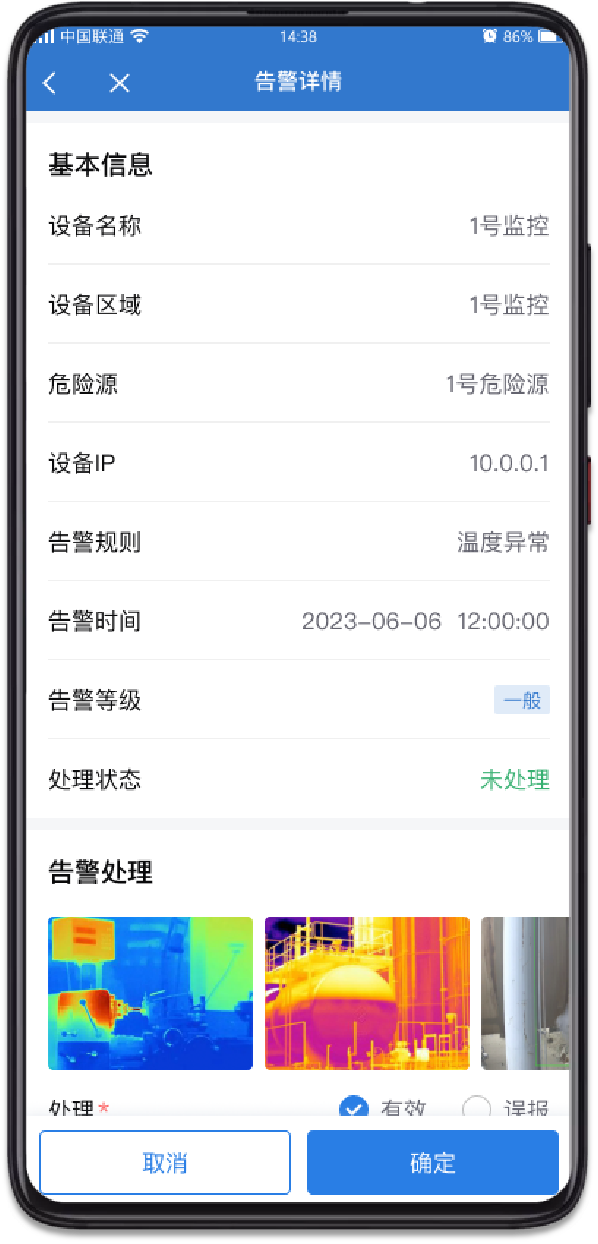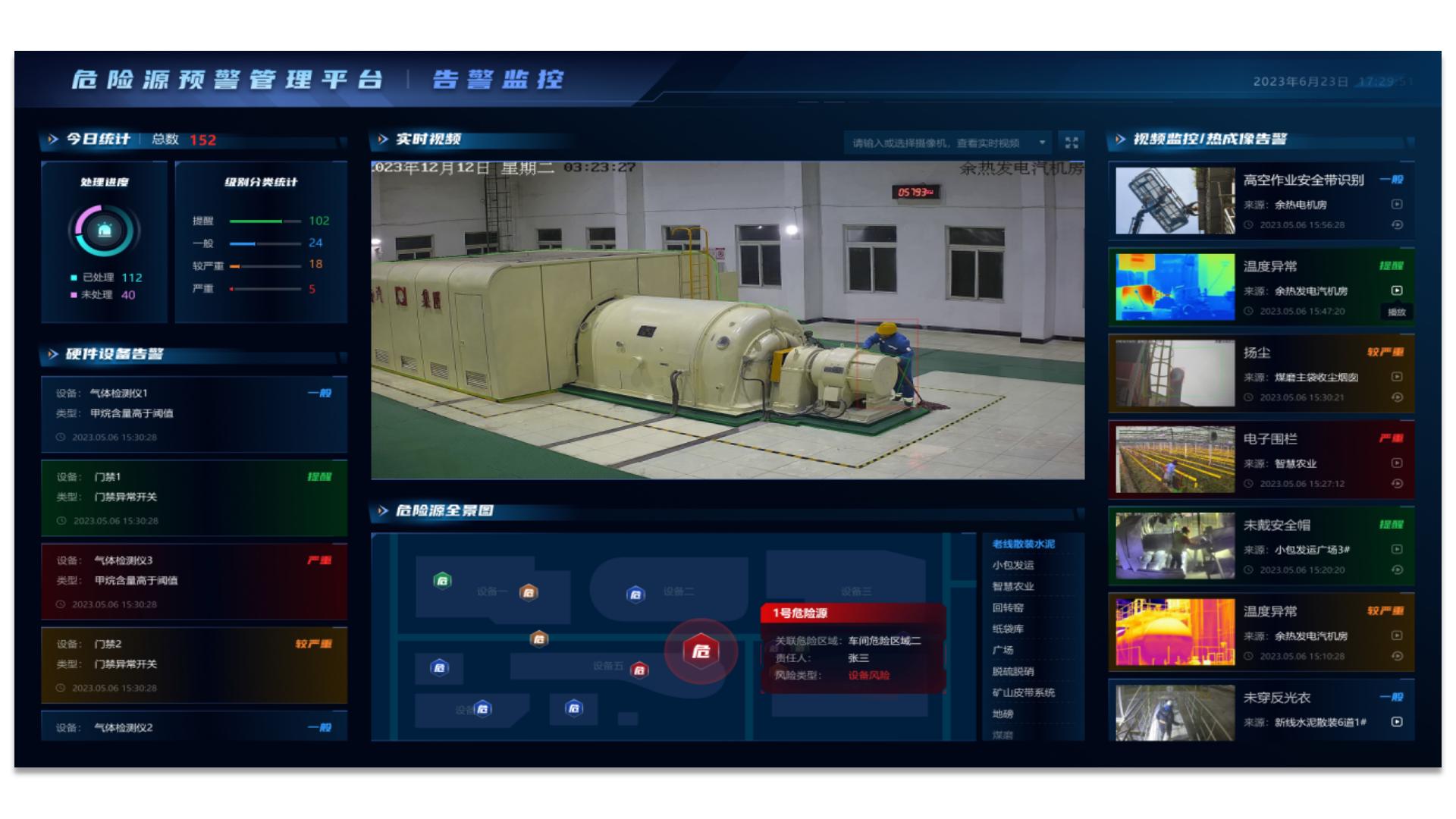 将现场危险源和安装的摄像机、热成像、气体检测仪等设备,进行整合联动管理,对各项数据实时监测分析、预警提醒。