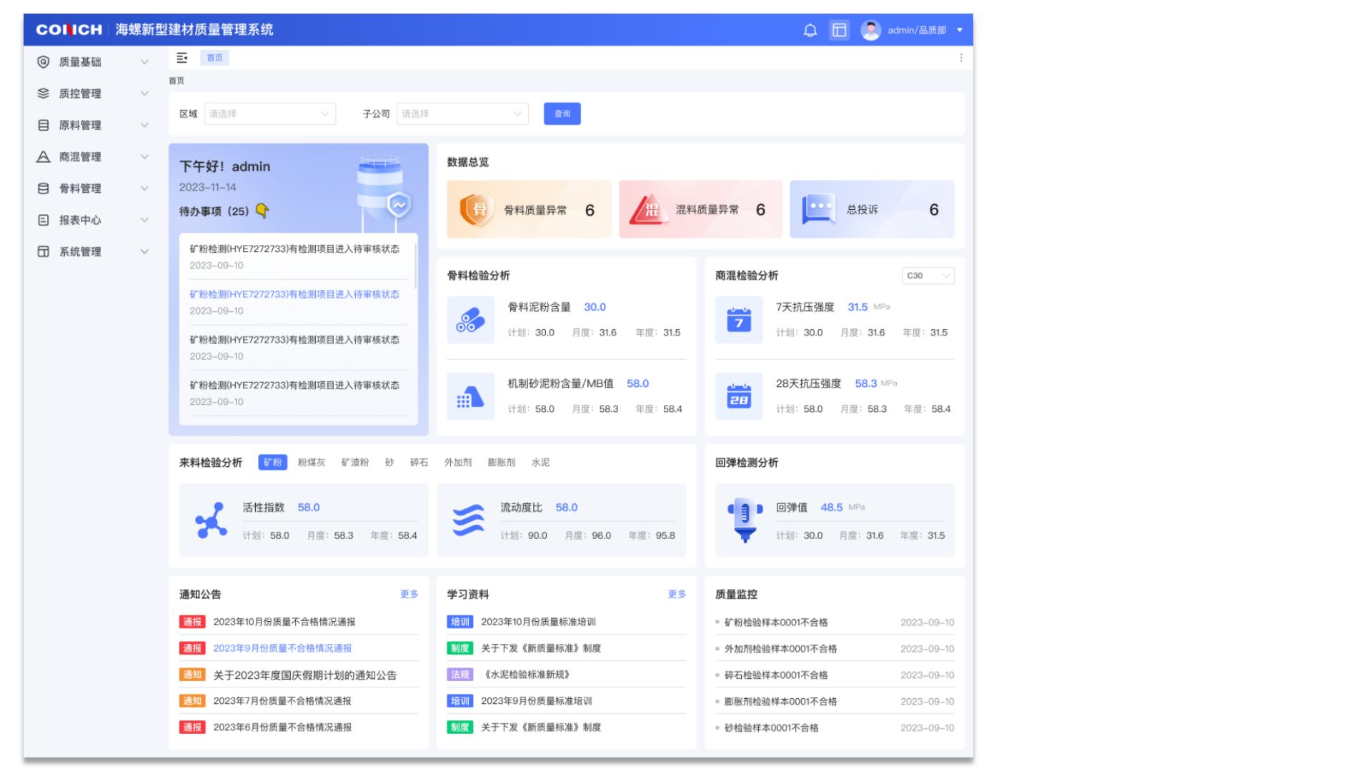 通过质控管理、原料管理、商混管理、骨料管理、报表中心等模块功能,充分融合海螺专业管理思路,建立商混、骨料等新型建材的生产执行、质量检测、质量分析的闭环管理机制。围绕人员管理、样品管理两大主线构建实验室标准化管理体系。