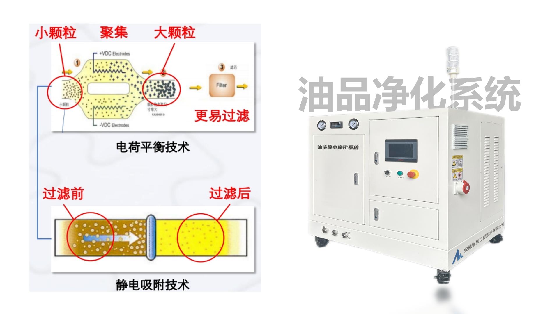 采用电荷平衡和静电吸附机理,可按离线、在线不同模式净化油液,配合油质在线监测系统实时监控调节油液品质。