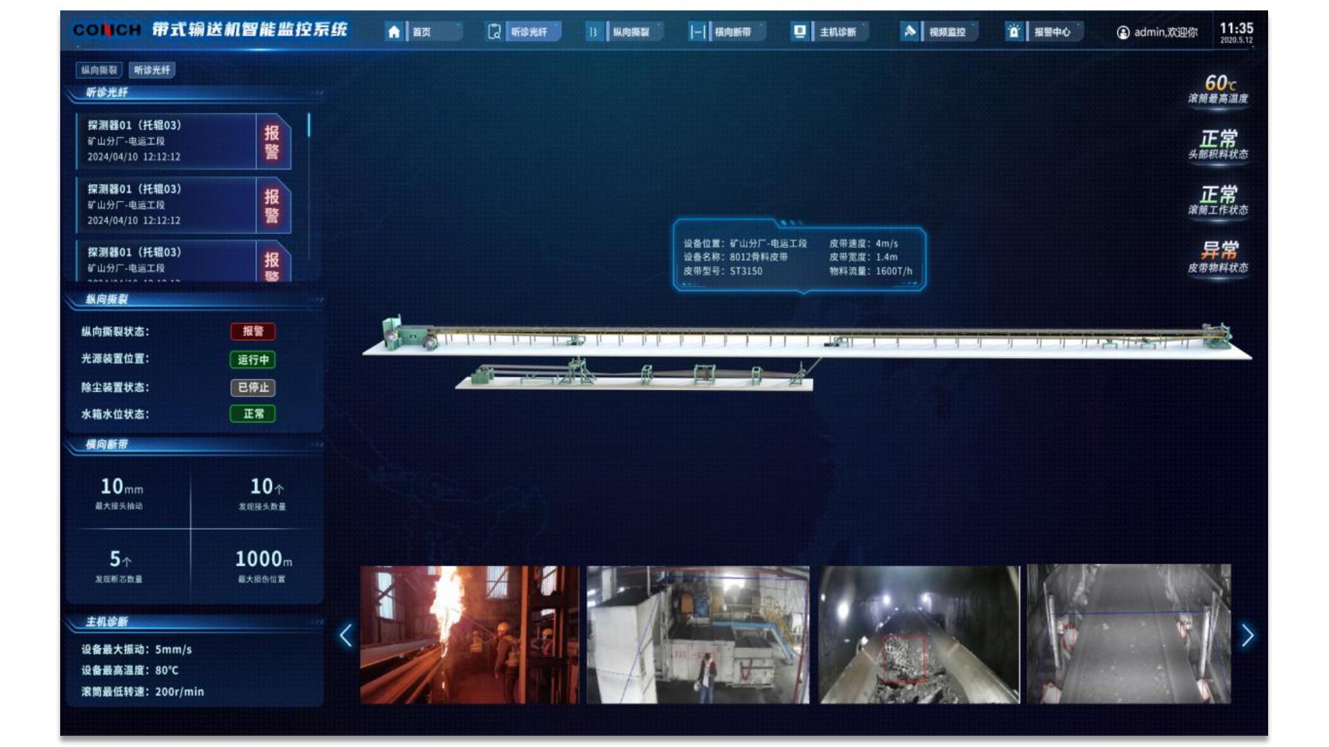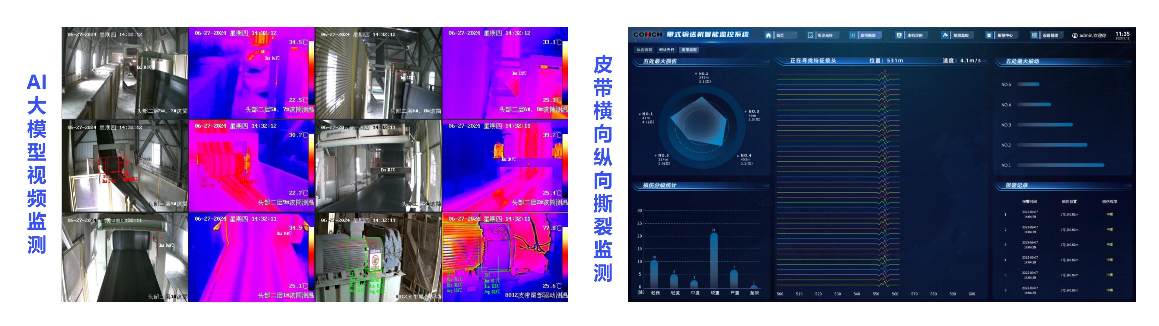 结合视觉CV大模型、光纤定位振动等技术,实现皮带横纵撕、皮带跑偏、滚筒堵转等故障监控。覆盖所有人工巡检监控场景,实现皮带机无人巡检及管控。