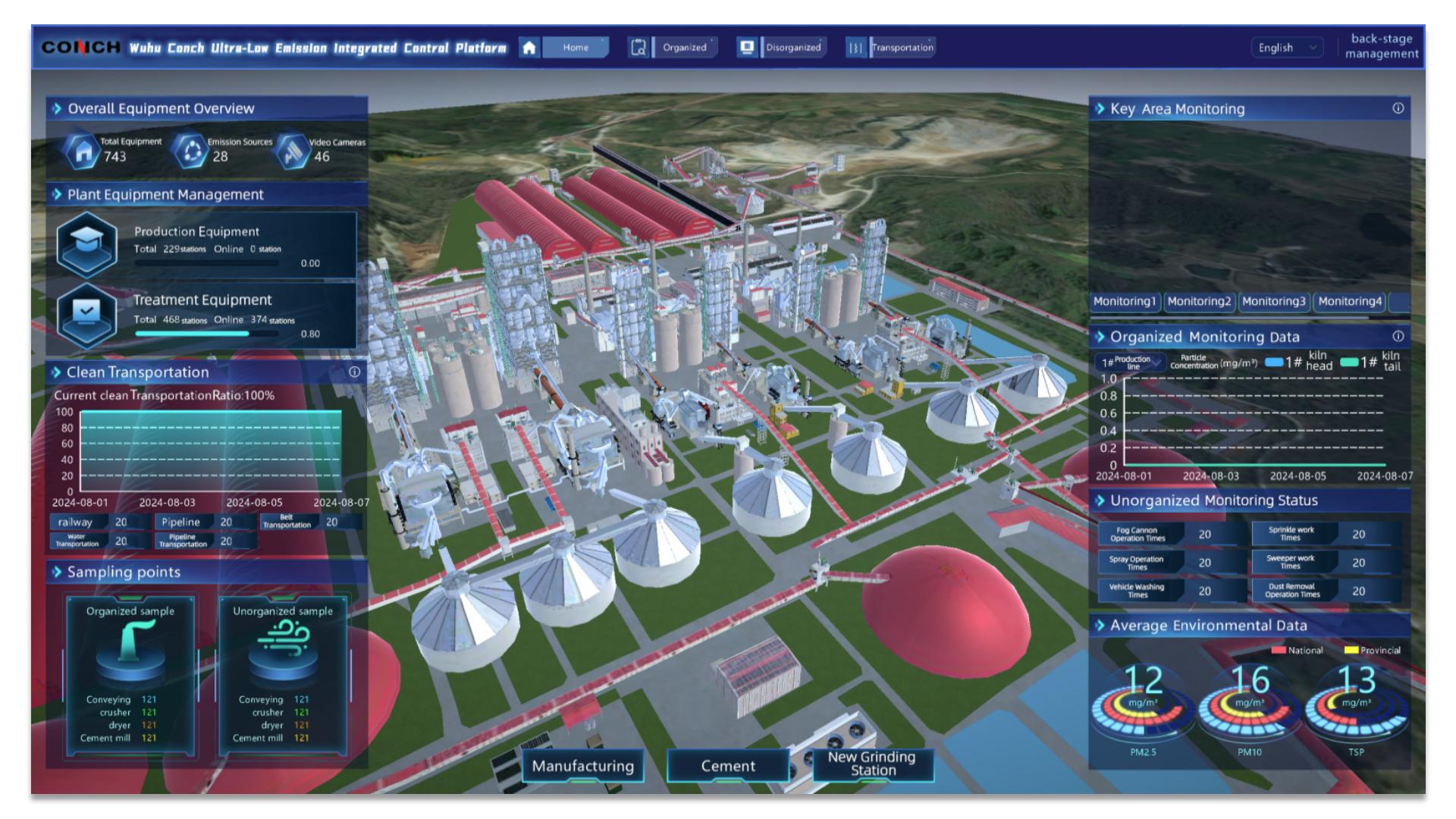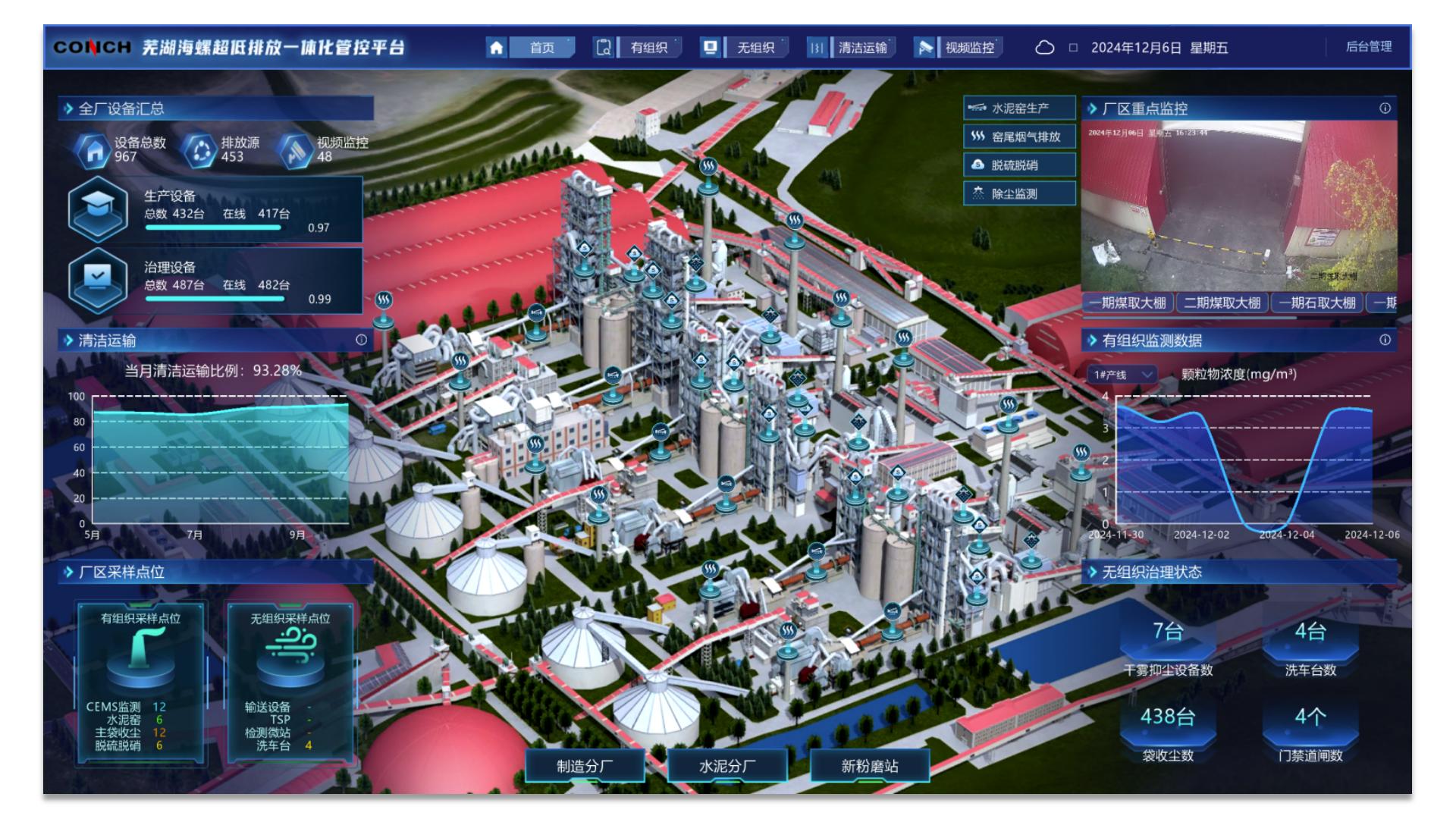 ● 集中展示有组织排放、无组织排放、清洁运输、厂区监控等实时数据